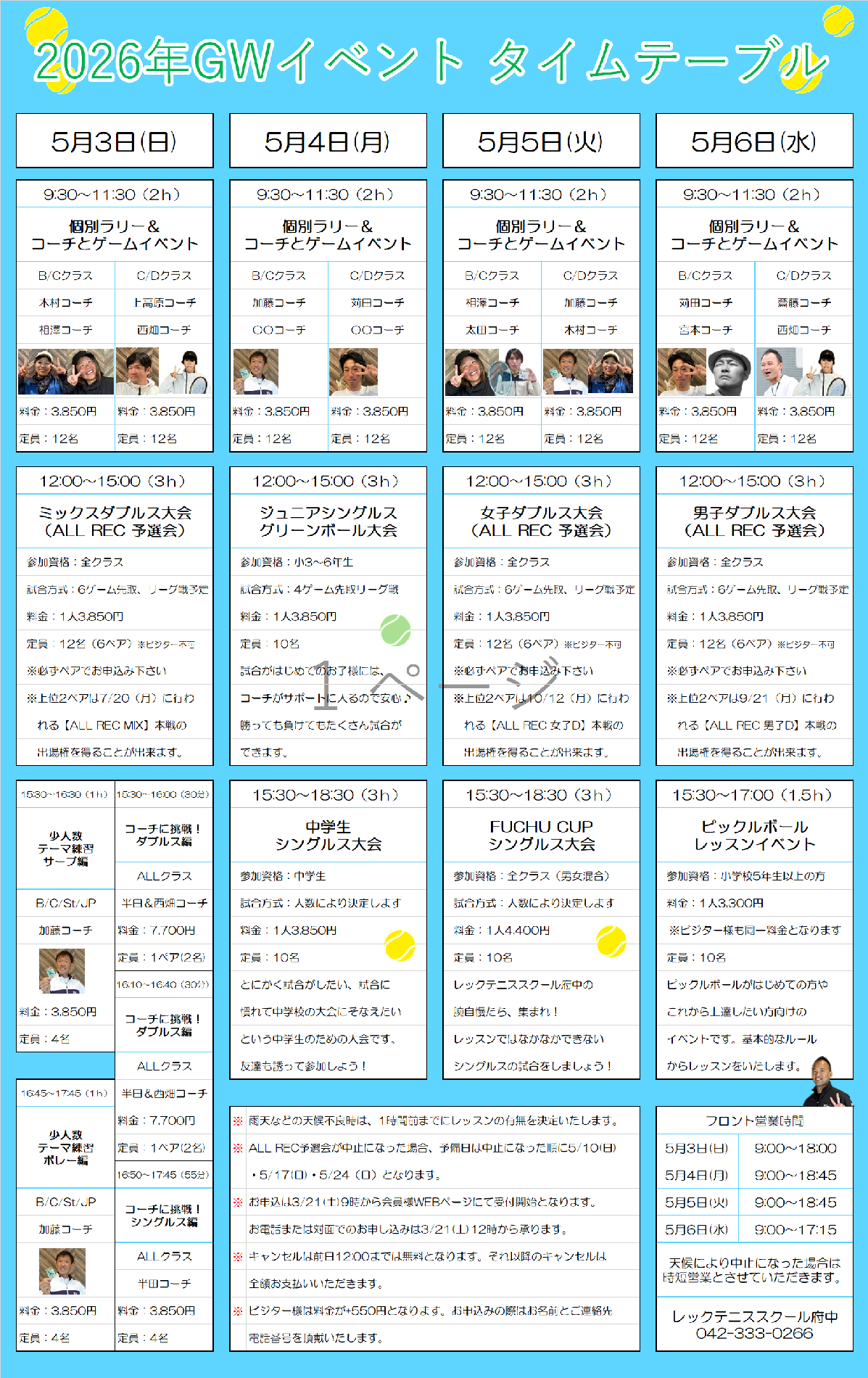 レッスンイベント、気軽に楽しむダブルス、シングルス大会、