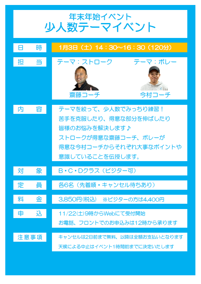 【年末年始イベント】のお知らせ 2025.12.25 お知らせ(全般)イベント 2025年12月29(月)・12月31日(水)・2026年1月2日(金)・1月3日(土)の4日間、 【年末年始イベント】を開催いたします。 様々なイベントが盛りだくさん! 皆様ぜひご参加ください♪ 前の記事 次の記事 お知らせ(全般) イベント レッスン キャンペーン