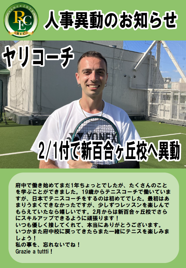 現在、水曜日と金曜日に府中校にて勤務しているカメラ・ヤリコーチが、2/1付けで新百合ヶ丘校の専属となるため、府中校から異動する事となりました。