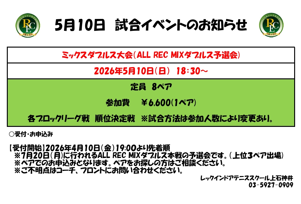 5月10日(日)ALL RECミックスダブルス予選大会のお知らせ