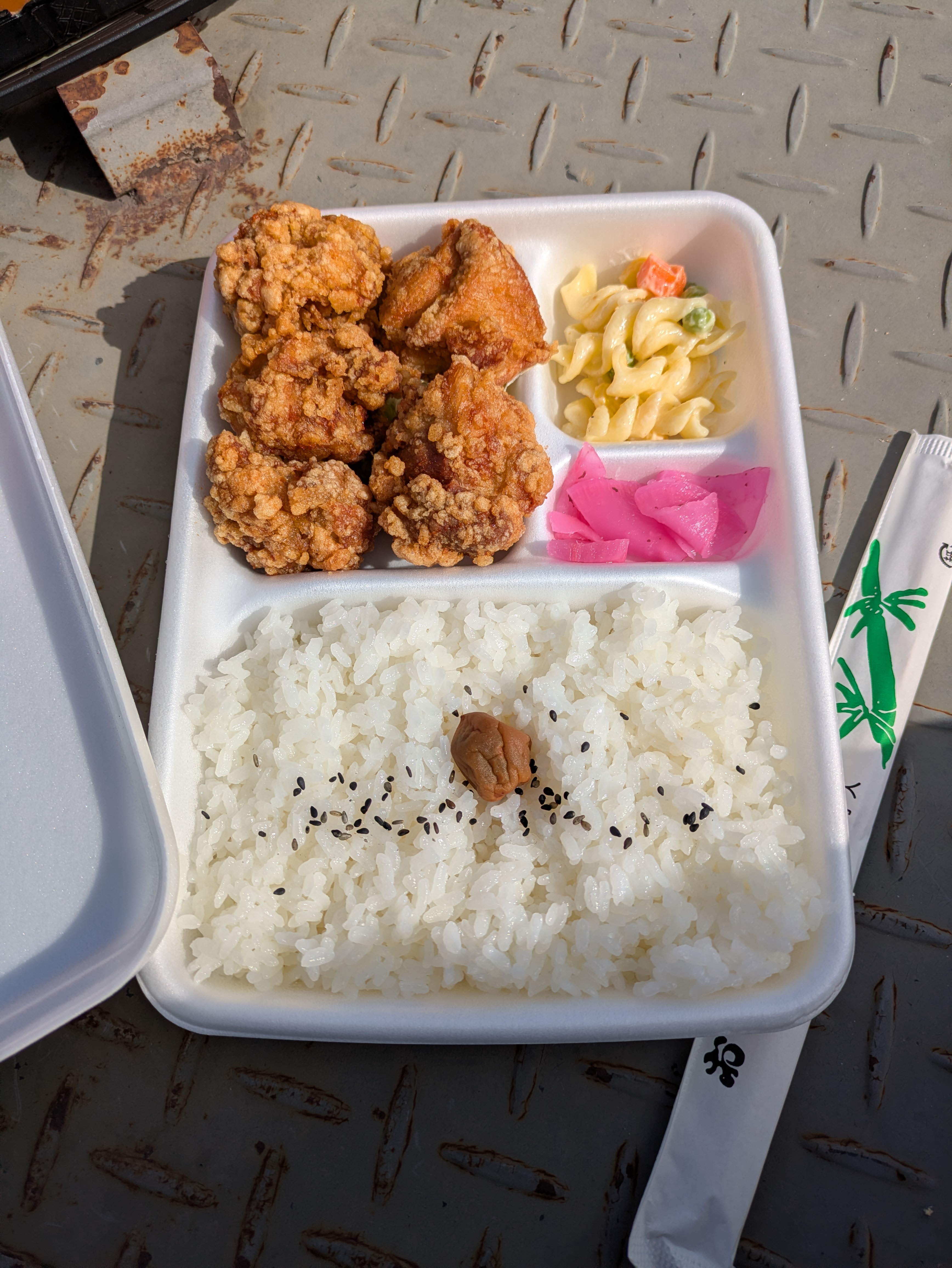 順調に時間2枚のペースで釣り上げていきアッという間に、10時30分過ぎに早めのお昼のお弁当配達「から揚げ弁当 ¥800」を釣り座でいただく。