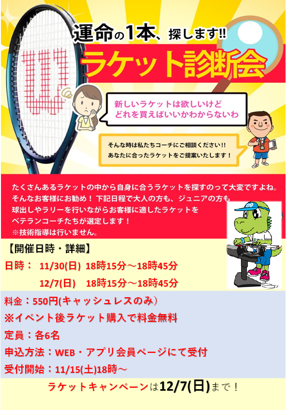 ラケット診断会開催のご案内 2025.11.10 お知らせ(全般)イベント ラケット診断会を開催します。 『新しいラケットは欲しいけど、どれを買えばいいかわからない』っていう方におすすめです! 詳細は下記をご確認ください。 申し込み方法はこちら 前の記事 次の記事 お知らせ(全般) イベント レッスン キャンペーン