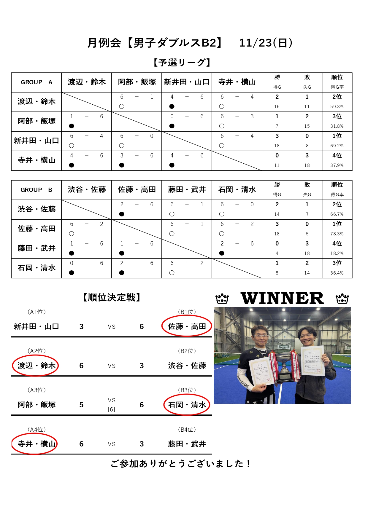 男子ダブルスB2結果のお知らせ 2025.11.23 お知らせ(全般)イベント 男子ダブルスB2結果をお知らせいたします。 優勝は佐藤様、髙田様でした! 初優勝!おめでとうございました!! 参加された皆様、お疲れさまでした。 前の記事 次の記事 お知らせ(全般) イベント レッスン キャンペーン