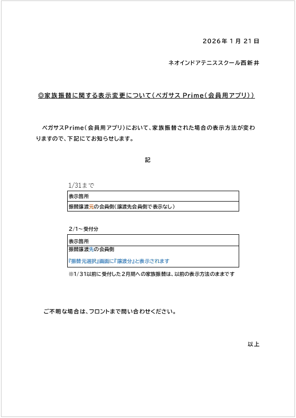 家族振替の表示変更について(ペガサスPrime) 2026.1.21 お知らせ(全般) 日頃より当スクールをご愛顧いただき、誠にありがとうございます。 家族振替の表示変更について(ペガサスPrime)ご連絡いたします。 前の記事 次の記事 お知らせ(全般) イベント レッスン キャンペーン