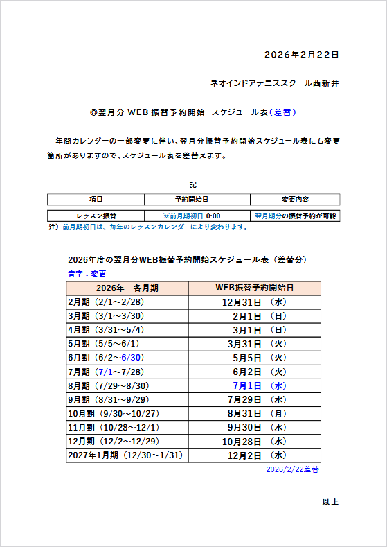 翌 月 分 WEB 振 替 予 約 開 始 スケジュール表 ( 差 替 )