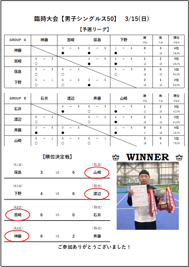 臨時大会 3/15 男子シングルス50 結果報告 2026.3.15 お知らせ(全般) 男子シングルス50 結果のお知らせ 優勝は山崎様でした!優勝おめでとうございます!! 前の記事 次の記事 お知らせ(全般) イベント レッスン キャンペーン