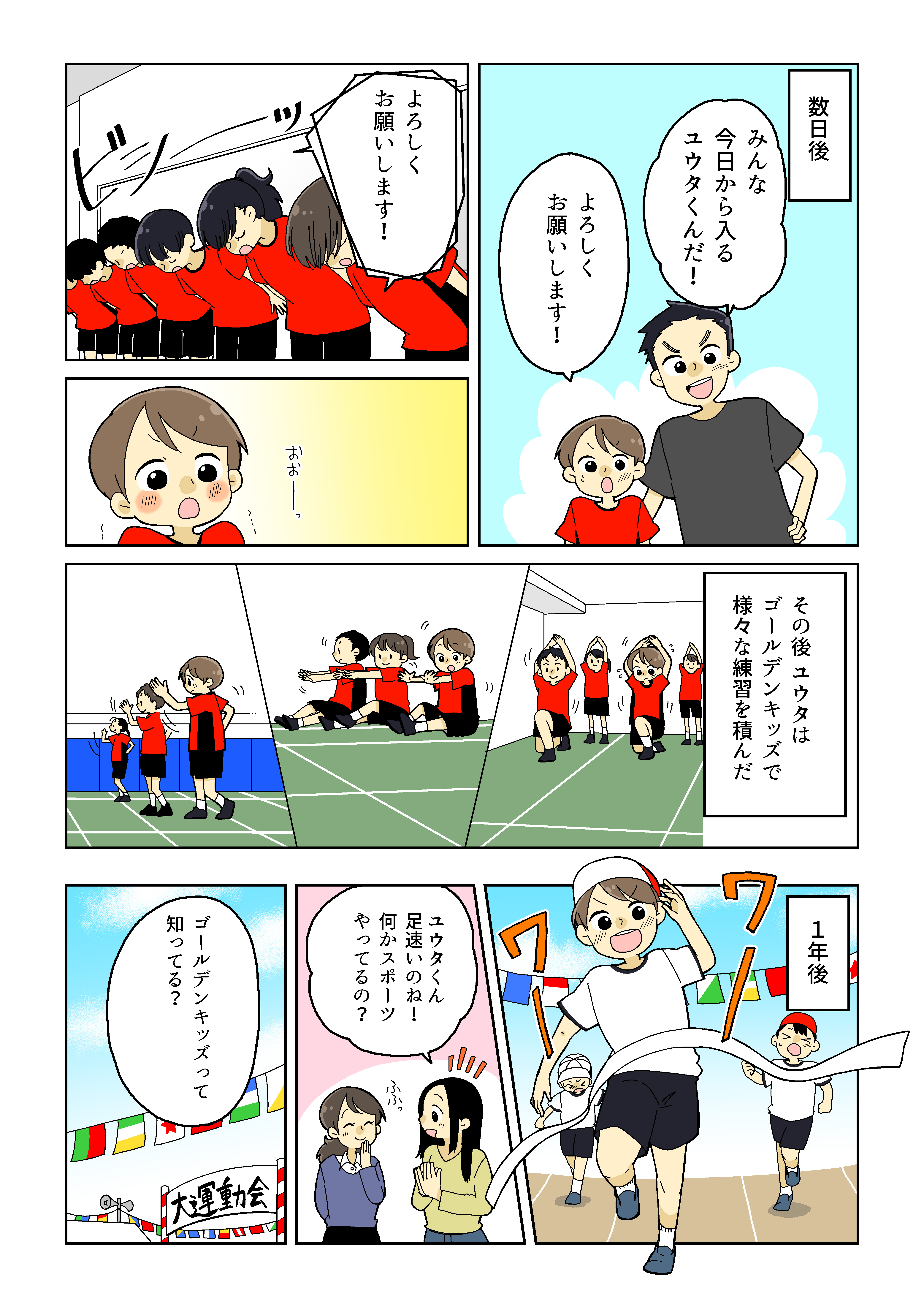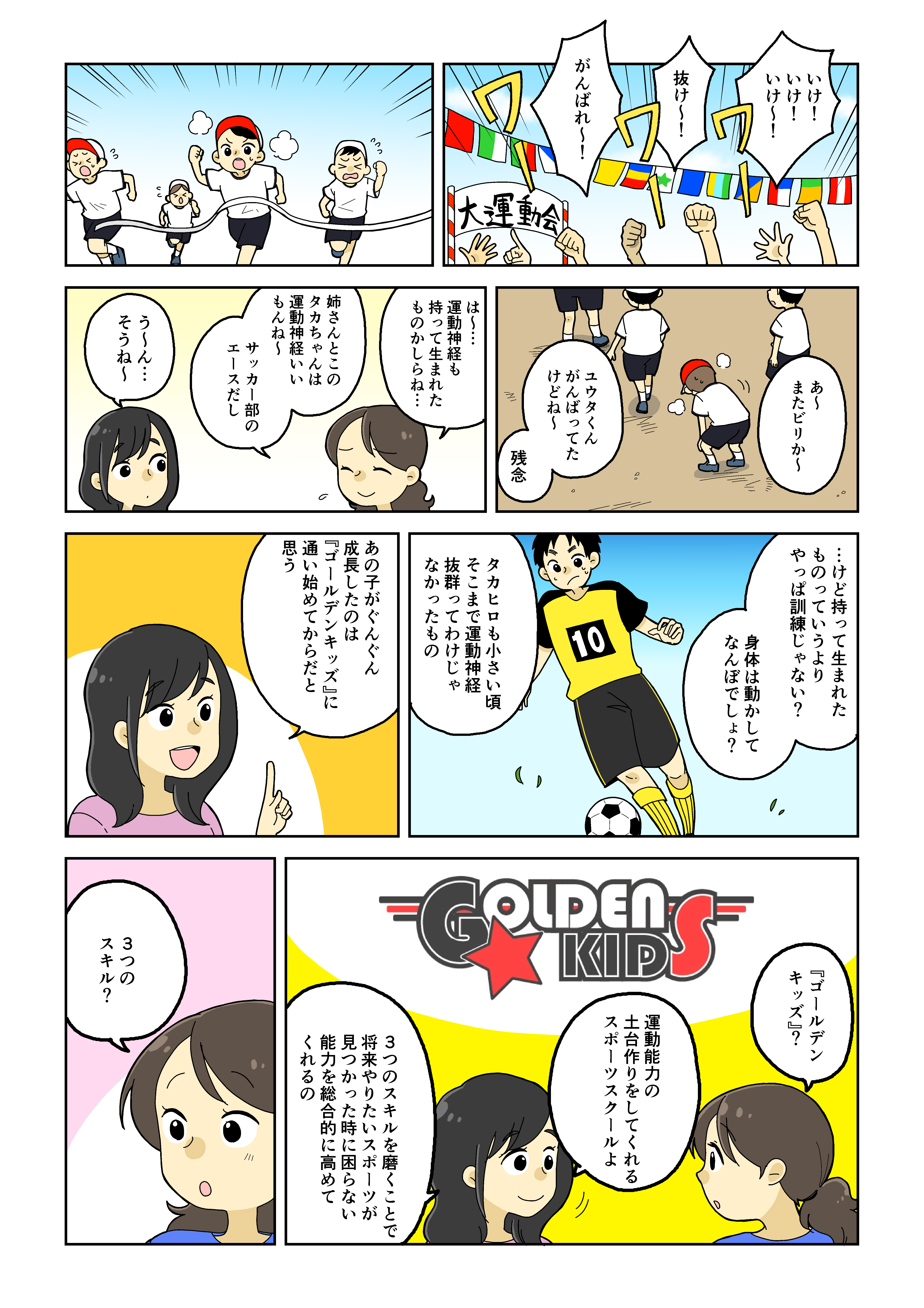 ゴールデンキッズは今しかない運動能力向上の期間(ゴールデンエイジ)に色々な運動をする事で将来どんなスポーツにも活かせるクラスであり、スポーツで体力をつける事で学業にも必要な集中力や、勉強を持続する為の体力を養う事ができます。