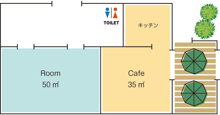 | 部屋 | カフェスペース(約34.5㎡)、Room(約50㎡) |
