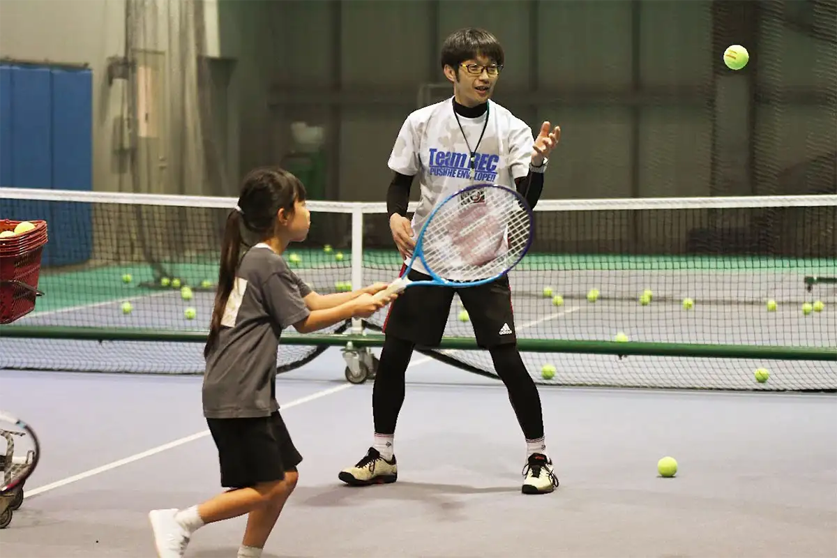 RECのコーチはテニスを教えるだけではなく、始まりと終わりの挨拶、集中力を養う(気持ちの切り替え)、順番を守る、みんなでボールを集める、レッスン中はコーチの指示に従う、などを大切にしながらレッスンをしています。